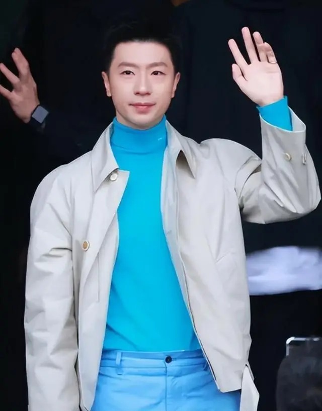 他穿亮蓝色立领内衬满,外面是灰色的夹克搭配蓝色西装裤,脚下是黑色平底鞋,没有刻意凹造型,却自带气场。