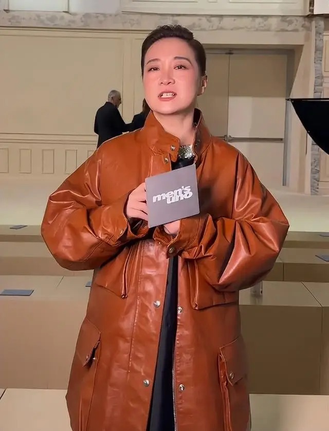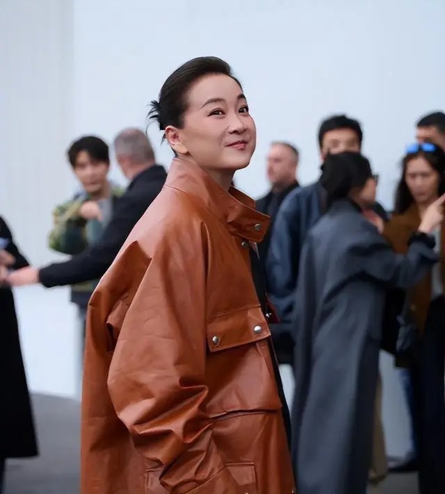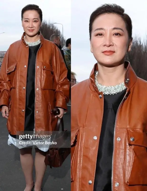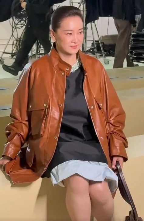 当天贾玲以Prada品牌嘉宾身份出席,穿的是该品牌2026春夏系列棕色皮衣,头发梳成利落盘发。